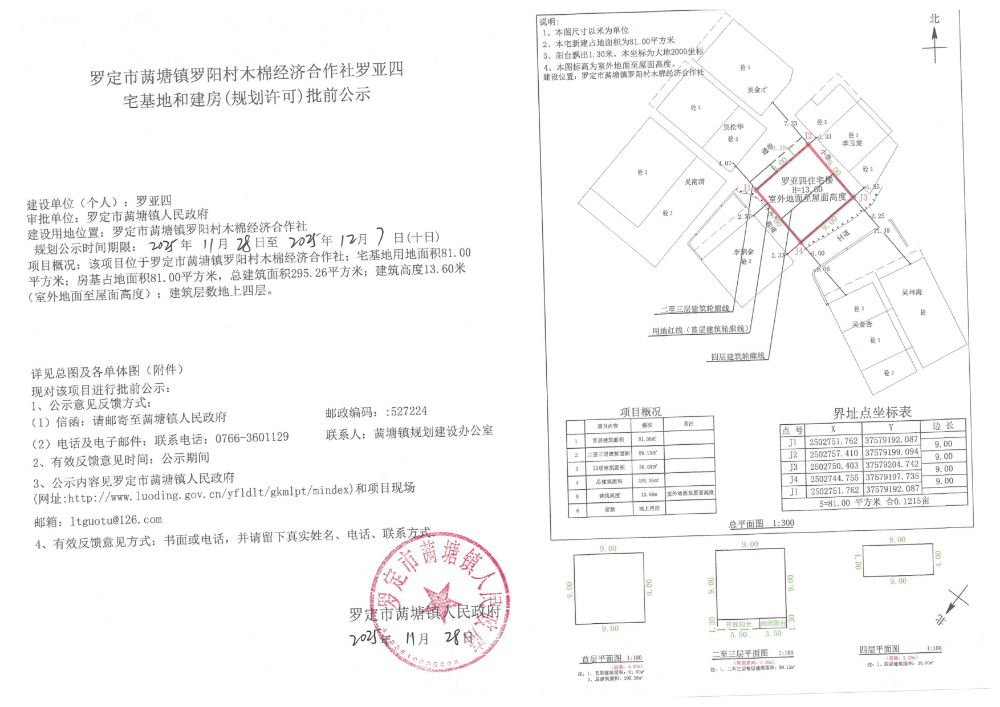 罗定市䓣塘镇罗阳村木棉经济合作社罗亚四宅基地和建房(规划许可)批前公示