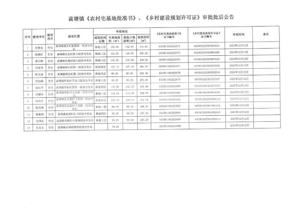 罗定市䓣塘镇《农村宅基地批准书》、《乡村建设规划许可证》批后公告2025.12