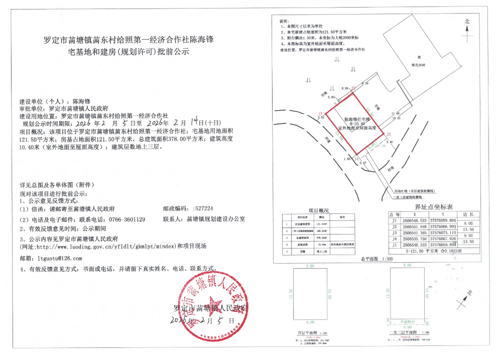 罗定市䓣塘镇䓣东村给照第一经济合作社陈海锋宅基地和建房(规划许可)批前公示