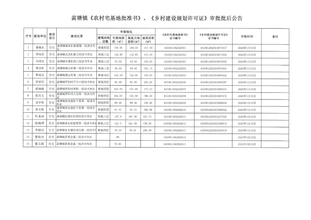 䓣塘镇《农村宅基地批准书》、《乡村建设规划许可证》审批批后公告2026.3