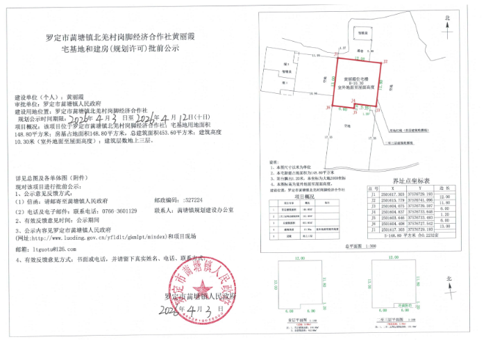 罗定市䓣塘镇北羌村委岗脚经济合作社黄丽霞宅基地和建房(规划许可)批前公示