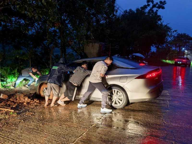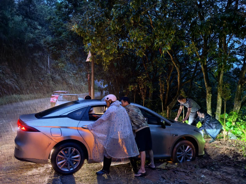 没过多久,两个村的党员干部陆续到位,现场的力量从2人增加到7人,还有开车经过的奇峰农业发展有限公司的2位老板,9人组成“临时救援小队”!大家喊着口号一起发力推车,没想到尝试了好几遍也推不出来。由于车轮不停转动翻泥,泥坑已经变得很深,得换个方案,“用我们的车拉出来吧!”奇峰农业的老板从车上拿出拖绳,把公司的车和陷泥车辆绑在了一起。现场有的帮忙指挥两台车调整方向,有的留意过往车辆做好警戒。“好!出来啦!出来啦!”陷泥车辆终于得到“解救”,现场一片欢呼。汪先生不停地向大家表示感谢,“还好有你们,真的是帮了一个大忙!我自己试了好久开不出来,雨又越下越大,还好你们来了,我心就定了,谢谢当地党员干部和热心群众!”